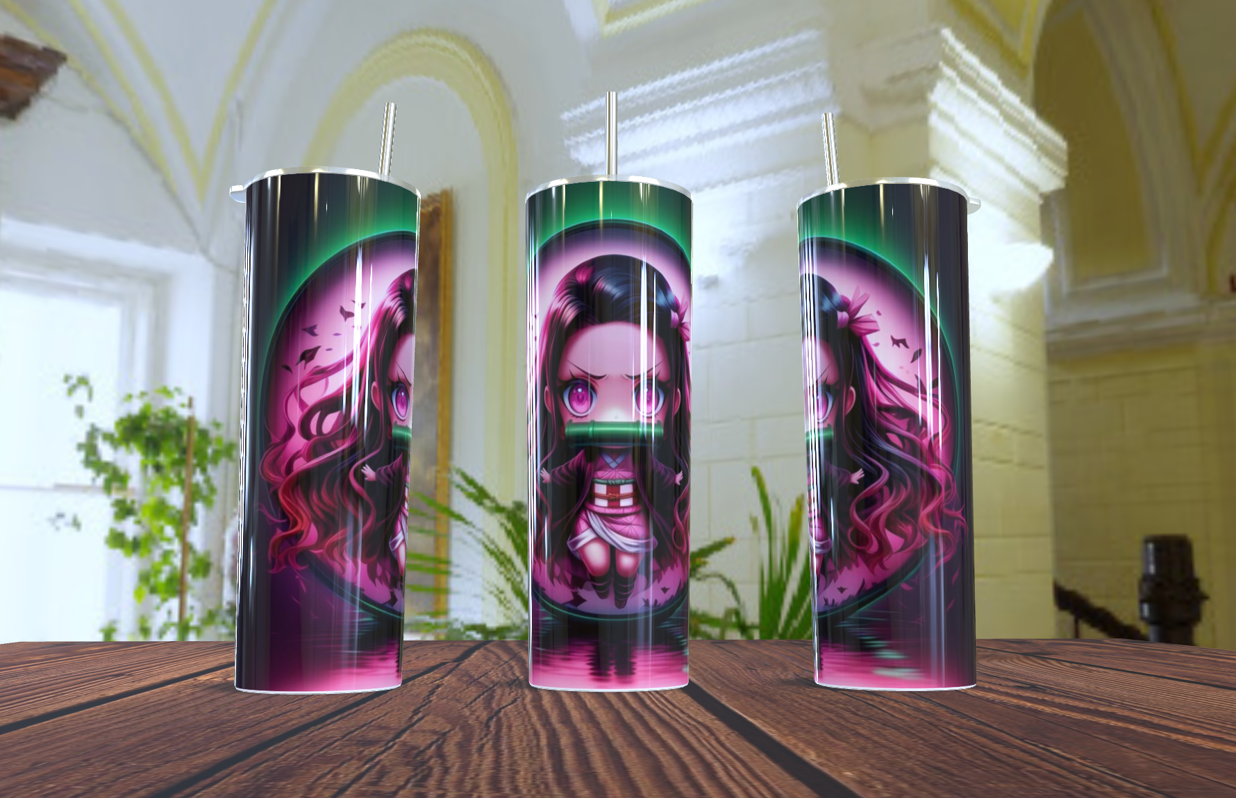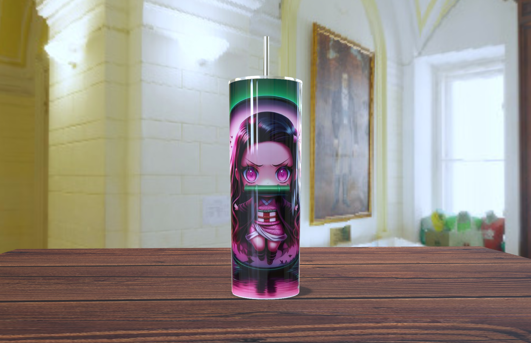 ¡Lleva la dulzura y la fuerza de Nezuko Kamado contigo a donde vayas! Este impresionante vaso tumbler captura a la heroína de Demon Slayer: Kimetsu no Yaiba en un adorable pero poderoso estilo chibi/kawaii.