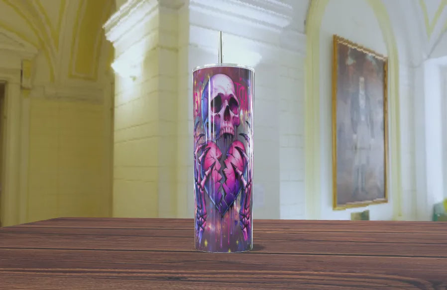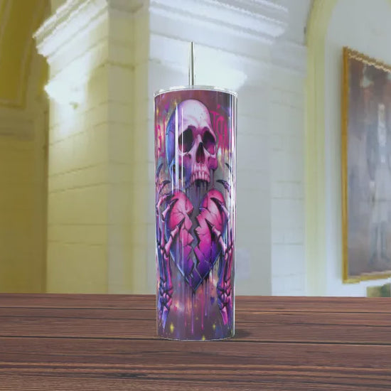Lleva tu bebida con un toque de rebeldía y estilo único. Este vaso térmico skinny presenta un diseño impresionante de una calavera sobre un corazón roto biomecánico, inmerso en un estallido de colores neón (púrpura, rosa, magenta y azul).
