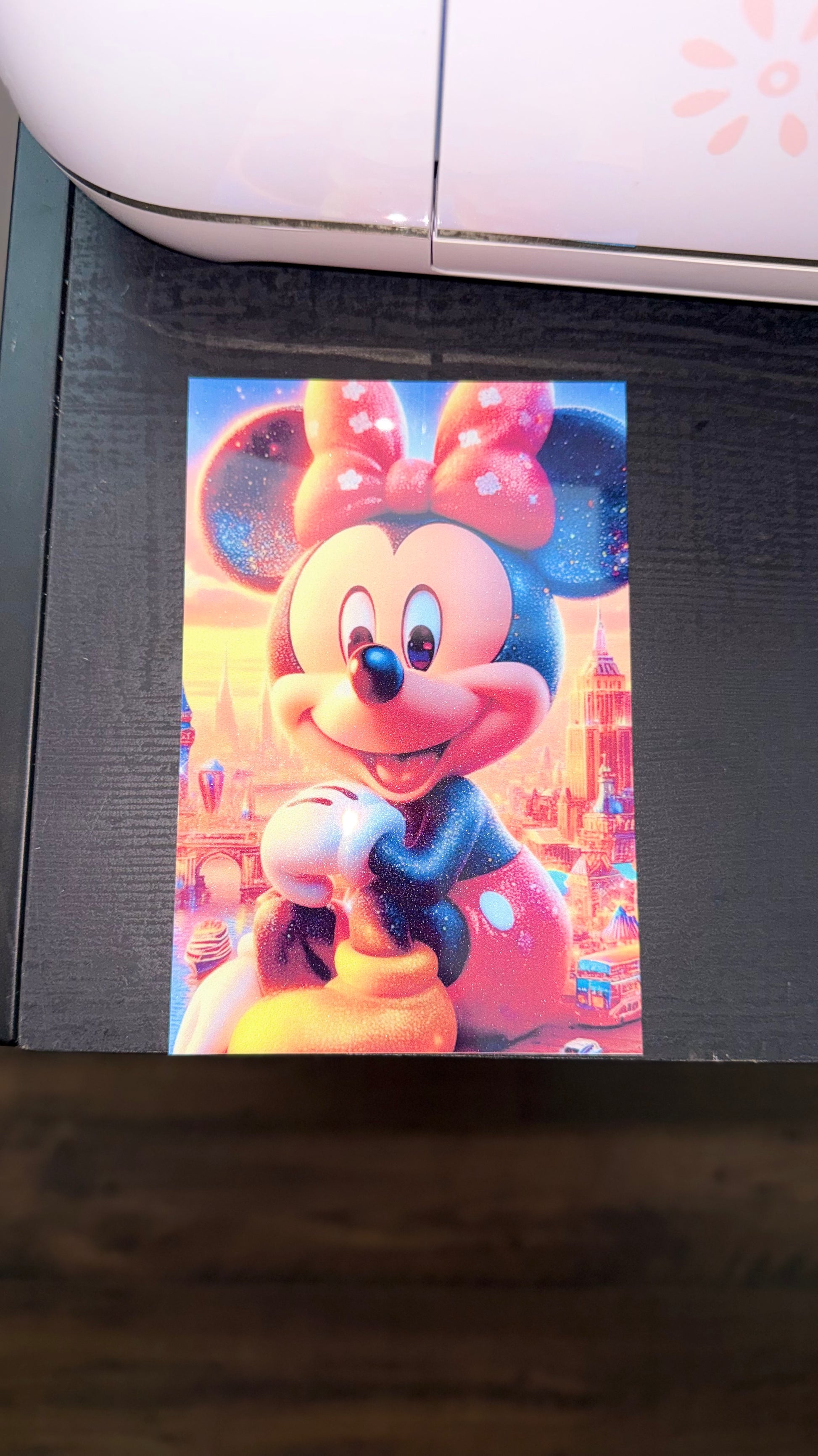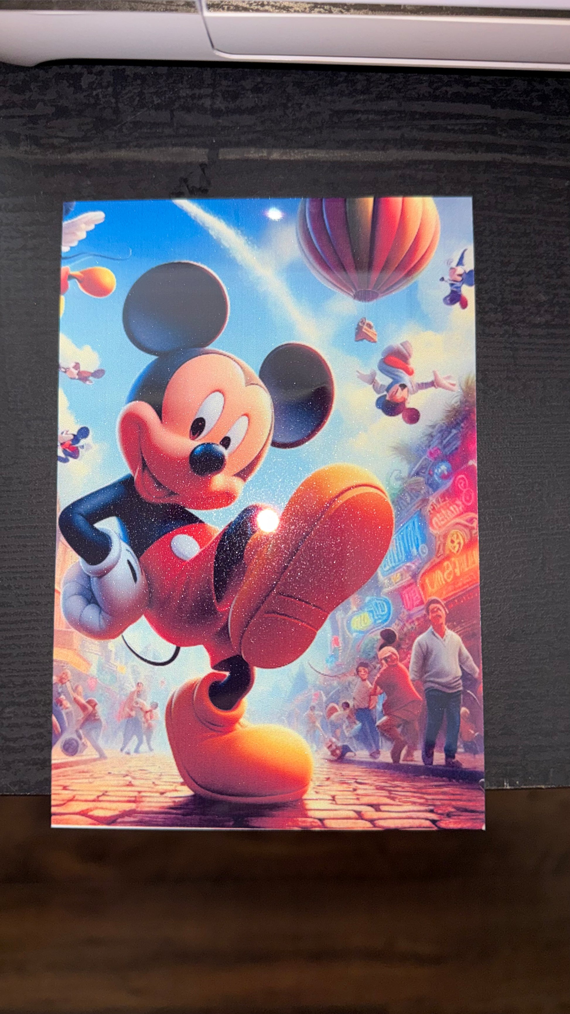 Magia Disney Clásica y Moderna: Personajes como Minnie Mouse y Mickey Mouse son reimaginados con un estilo urbano y brillante, y Stitch se presenta en un vibrante lienzo de acuarela azul y rojo.
