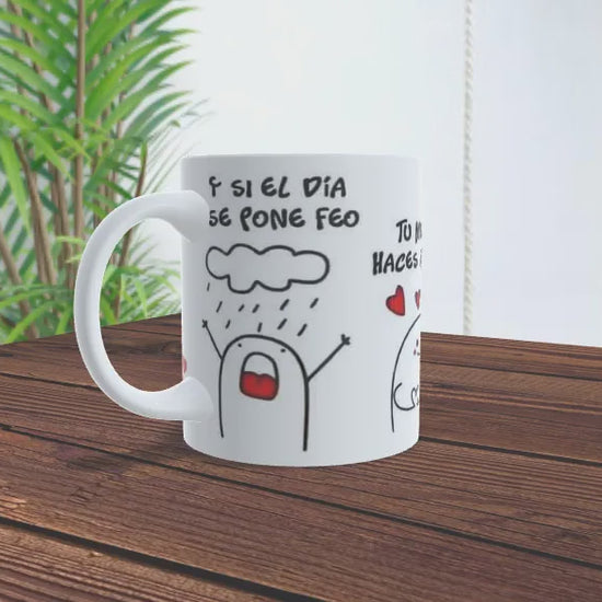 ¿Tienes a esa persona que es tu rayo de sol incluso cuando todo sale mal? Esta taza con el icónico personaje Flork es la forma más divertida y honesta de decir "gracias por estar ahí". Con la frase "Y si el día se pone feo... tú me haces feliz", es el detalle ideal para parejas, mejores amigos o ese compañero de trabajo que siempre te saca una carcajada.