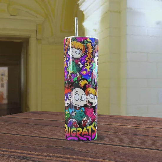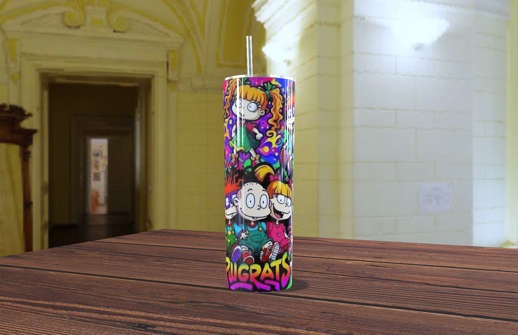 Este tumbler inspirado en Rugrats presenta un diseño vibrante con los personajes más queridos del show: Tommy, Chuckie, Angelica y el resto de la pandilla. Su ilustración colorida y llena de detalles captura perfectamente la energía traviesa y divertida de la serie.