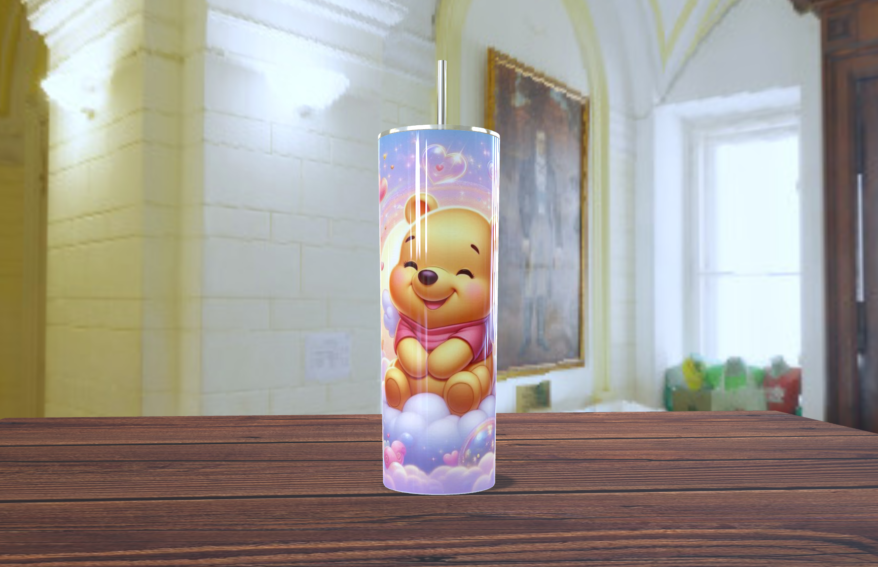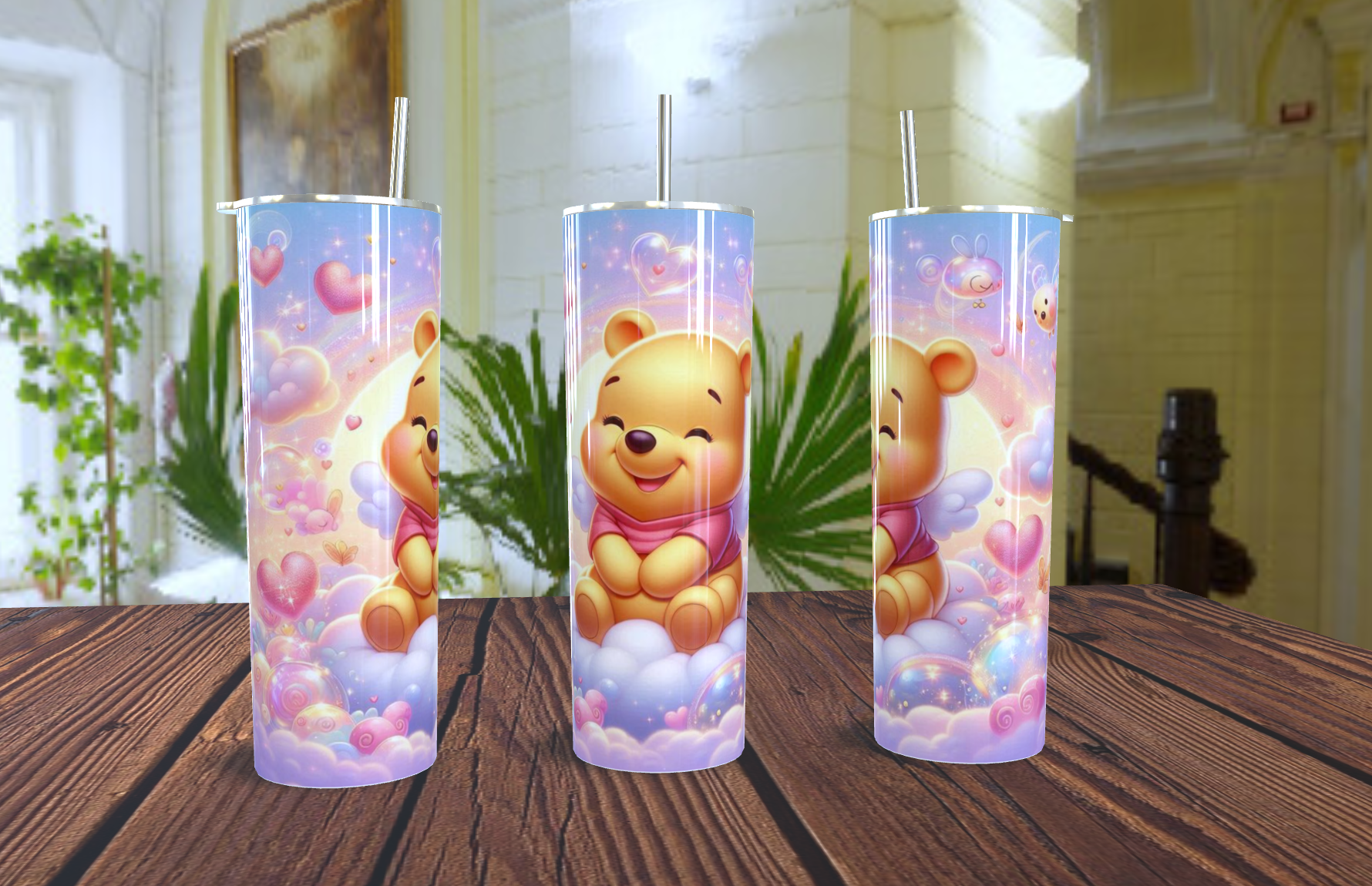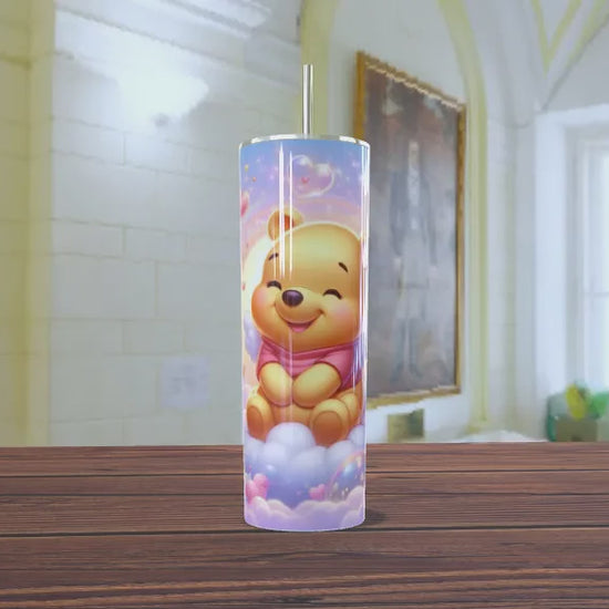 Este hermoso tumbler de acero inoxidable está decorado con un adorable diseño de oso disfrutando un día soleado, rodeado de flores y colores vivos que transmiten alegría y ternura. Perfecto para niños o para quienes aman los diseños dulces y alegres.
