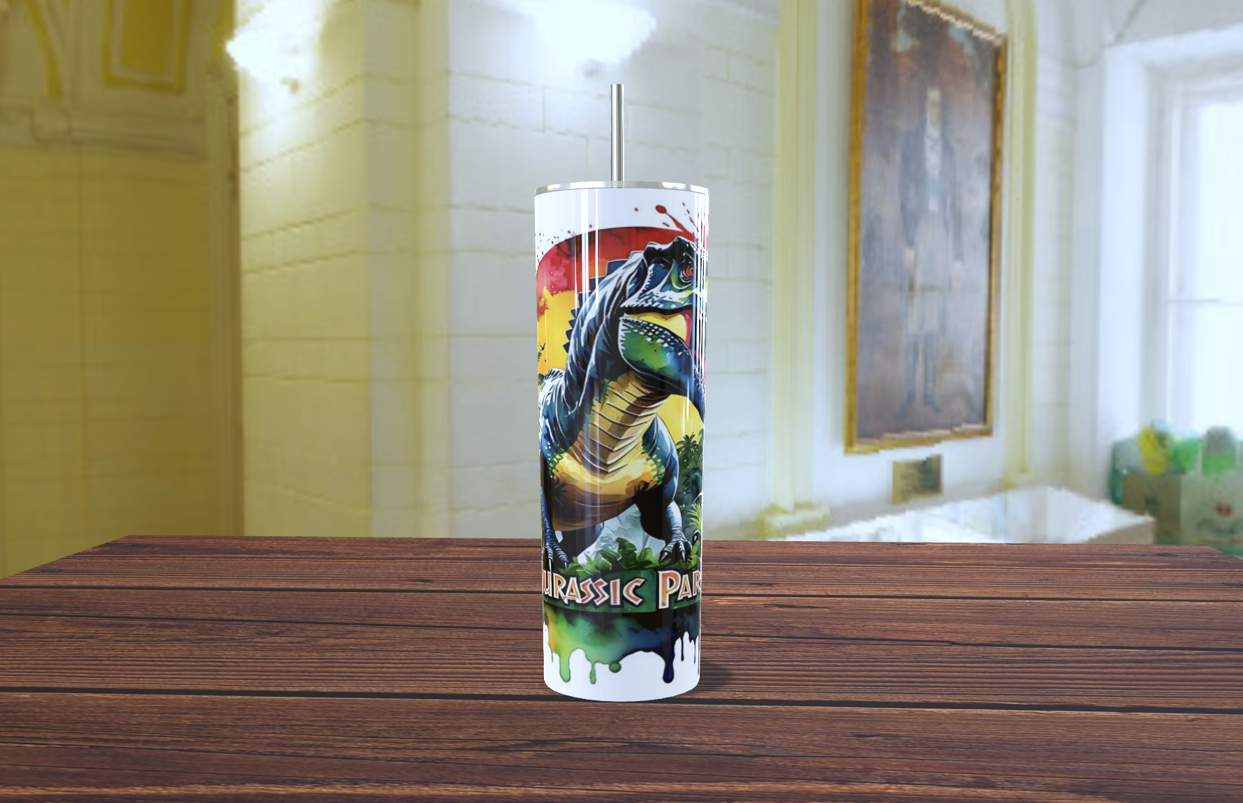 Diseño: Gráfico de T-Rex de alta resolución con el logo de Jurassic Park y efecto de salpicadura de pintura.